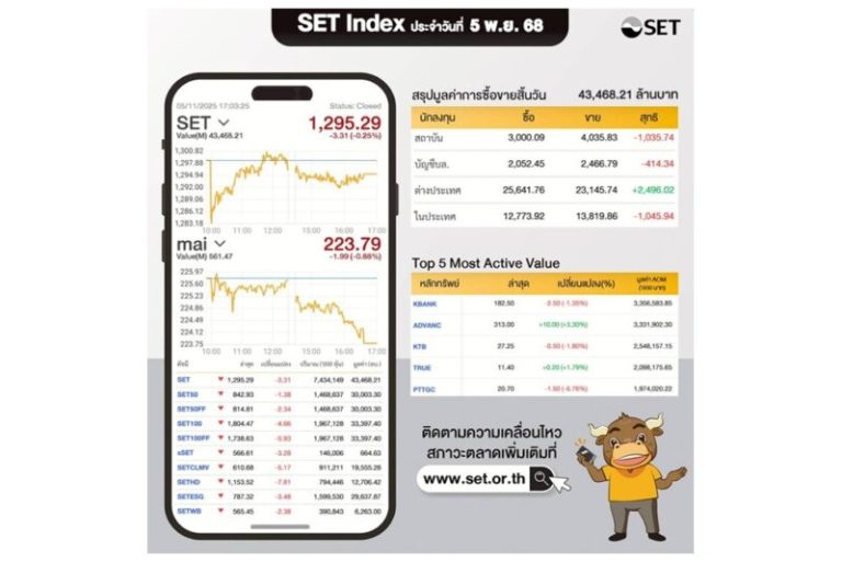 เศรษฐกิจ / ธุรกิจ หุ้นไทยปิดวันนี้ 4 พฤศจิกายน 2568 ที่ 1,298.60 -10.26 มูลค่าซื้อขาย 40,719.65 ล้านบาท นักลงทุนต่างประเทศขาย -867.73 ล้านบาท