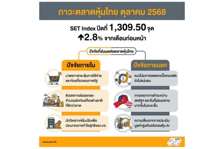 เศรษฐกิจ / ธุรกิจ ตลาดหุ้นไทยเดือนต.ค.68 ได้รับปัจจัยบวกจากหลายด้าน มาตรการกระตุ้นการใช้จ่ายภรครัฐ-กำไรกลุ่มธนาคารดีกว่าคาด-ส่งออกและจำนวนนักท่องเที่ยวสูงกว่าประมาณการ