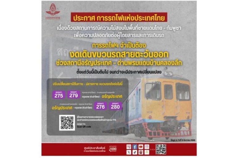 เศรษฐกิจ / ธุรกิจ ปะทะชายแดนไทย-กัมพูชา การรถไฟฯ แจ้งงดเดินขบวนรถธรรมดาที่ 275/276 และ 279/280 ชั่วคราว เฉพาะช่วงอรัญประเทศ-ด่านพรมแดนบ้านคลองลึก จนกว่าจะมีประกาศเปลี่ยนแปลง