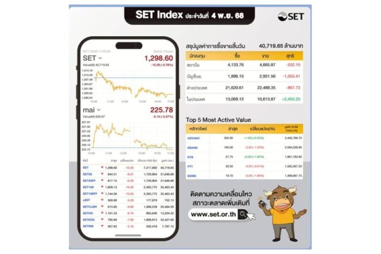 เศรษฐกิจ / ธุรกิจ หุ้นไทยปิดวันนี้ 4 พฤศจิกายน 2568 ที่ 1,298.60 -10.26 มูลค่าซื้อขาย 40,719.65 ล้านบาท นักลงทุนต่างประเทศขาย -867.73 ล้านบาท